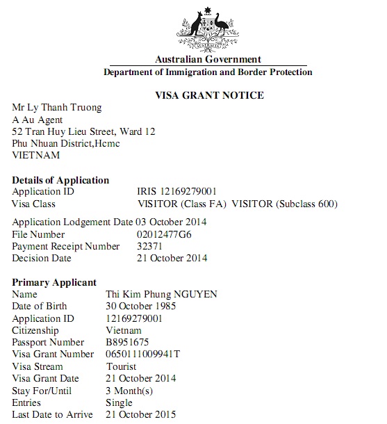 Công ty tư vấn du học Á-Âu chúc mừng chị Nguyễn Thị Kim Phụng đậu Visa du lịch Úc.