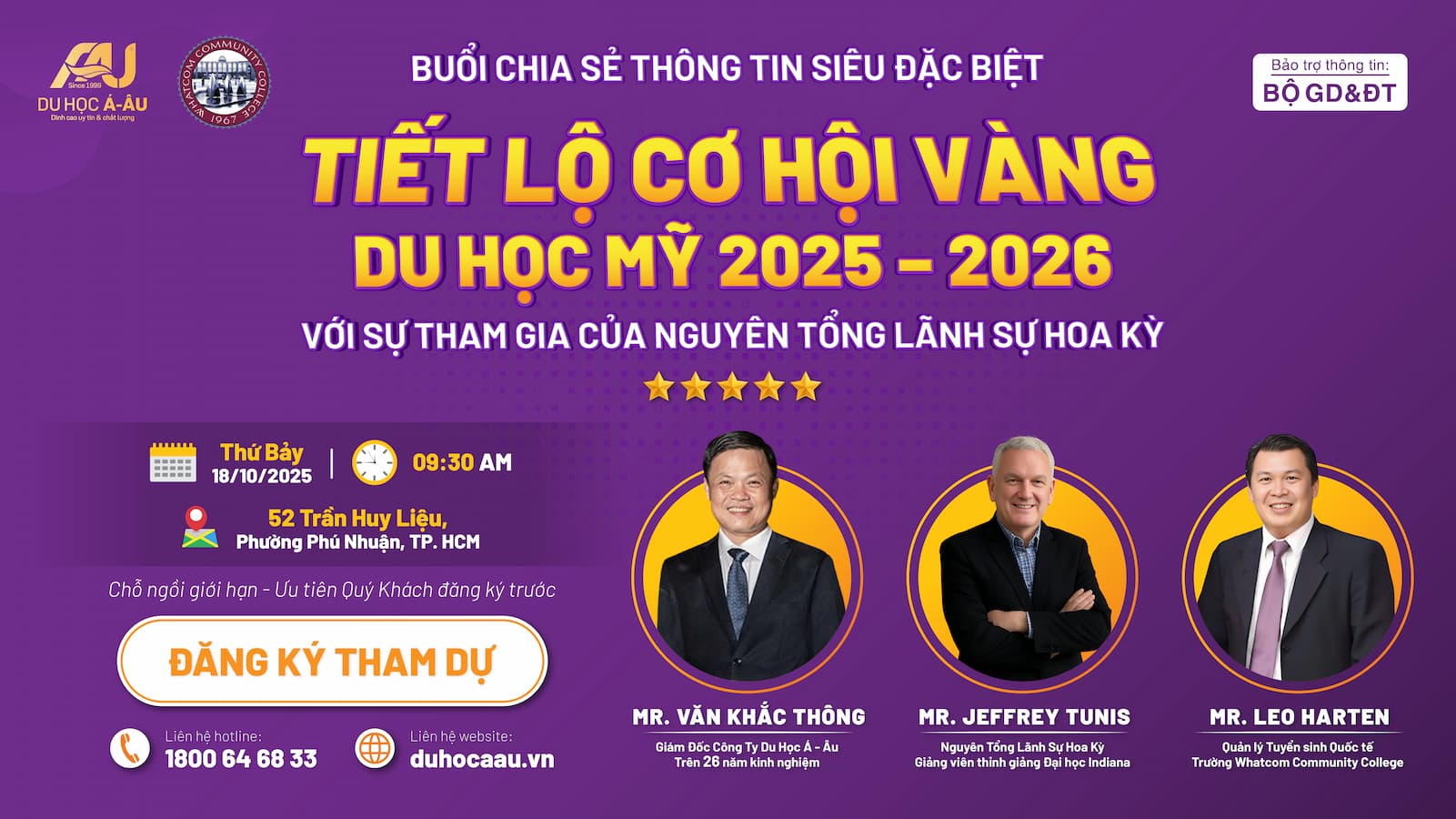 Hiểu được nhu cầu đó, Công ty Du học Á - Âu tổ chức Buổi chia sẻ thông tin siêu đặc biệt: “Tiết lộ cơ hội vàng du học Mỹ 2025 – 2026”, diễn ra vào lúc 09:30 – Thứ Bảy, ngày 18/10/2025 tại 52 Trần Huy Liệu, P. Phú Nhuận, TP.HCM.
