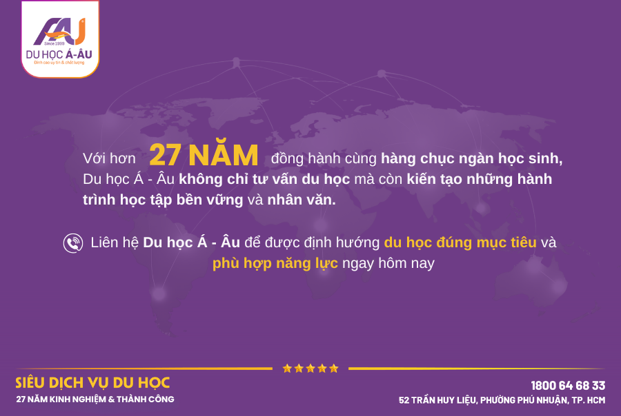 Với hơn 27 năm kinh nghiệm, phương châm hoạt động “Xem khách hàng như người thân”, Du học Á – Âu cam kết mang đến giải pháp du học chính xác, minh bạch và hiệu quả nhất cho học sinh và phụ huynh.